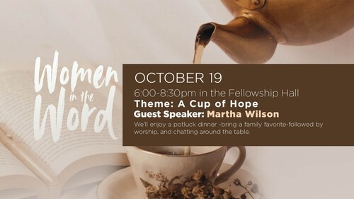 Ladies, you are invited to join us for an evening of fellowship and encouragement on Sunday, October 19th from 6:00–8:30 PM in Fellowship Hall. We’ll share in a delicious potluck themed Fall Flavors Fiesta featuring the tastes of autumn. Bring your favorite seasonal dish filled with flavors like pumpkin, apples, sweet potatoes, or cinnamon. The evening will include worship, meaningful table talk, and an inspiring message from Martha Wilson, “A Cup of Hope.” With over 25 years of experience in women’s ministry, Martha’s heart for encouragement and faith will bless us all. Come ready to enjoy community, conversation, and the warmth of God’s presence together!