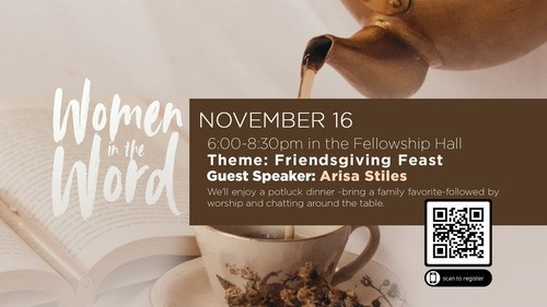 You’re invited to join us for Women in the Word on Sunday, November 16 at 6:00pm in the Fellowship Hall as we gather for a special Friendsgiving Feast, potluck style! We’ll begin the evening by sharing a delicious meal together, followed by worship through music. Then, we’ll hear a powerful testimony from Arisa Stiles, titled “From Muslim to Christianity: A Young Woman’s Journey to Jesus.” Afterward, we’ll spend time in Table Talk, connecting and reflecting together. Bring a dish to share and invite a friend to celebrate this season of gratitude, faith, and fellowship with us.